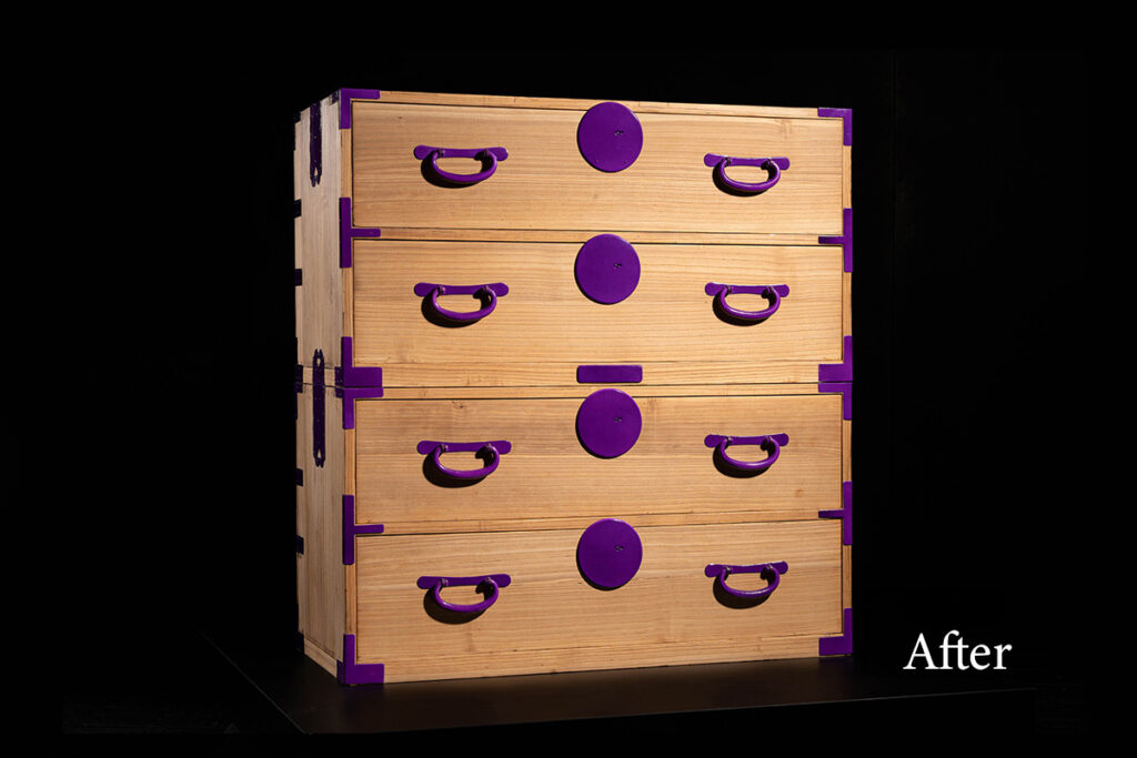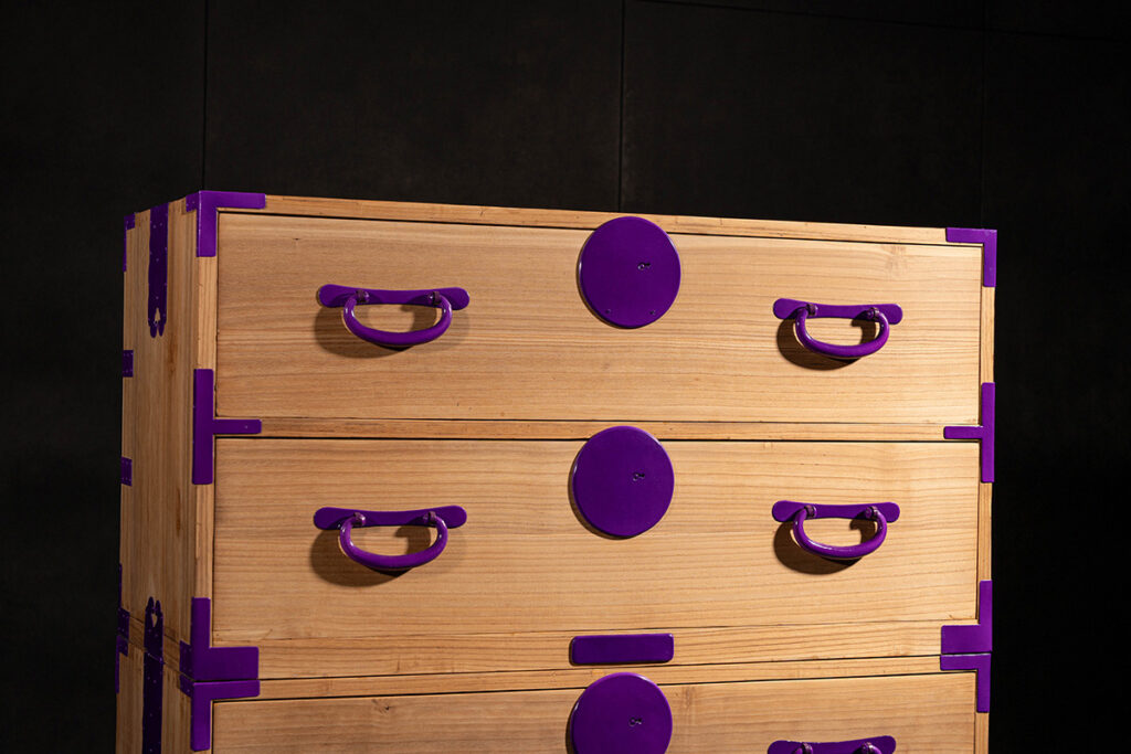 時代家具の金具を、日本の伝統色で塗り上げました。 火色・桃色・菖蒲・萌黄・黄檗。 いずれも古来より縁起の良いとされてきた色です。 5つの色を纏った5点の箪笥です。