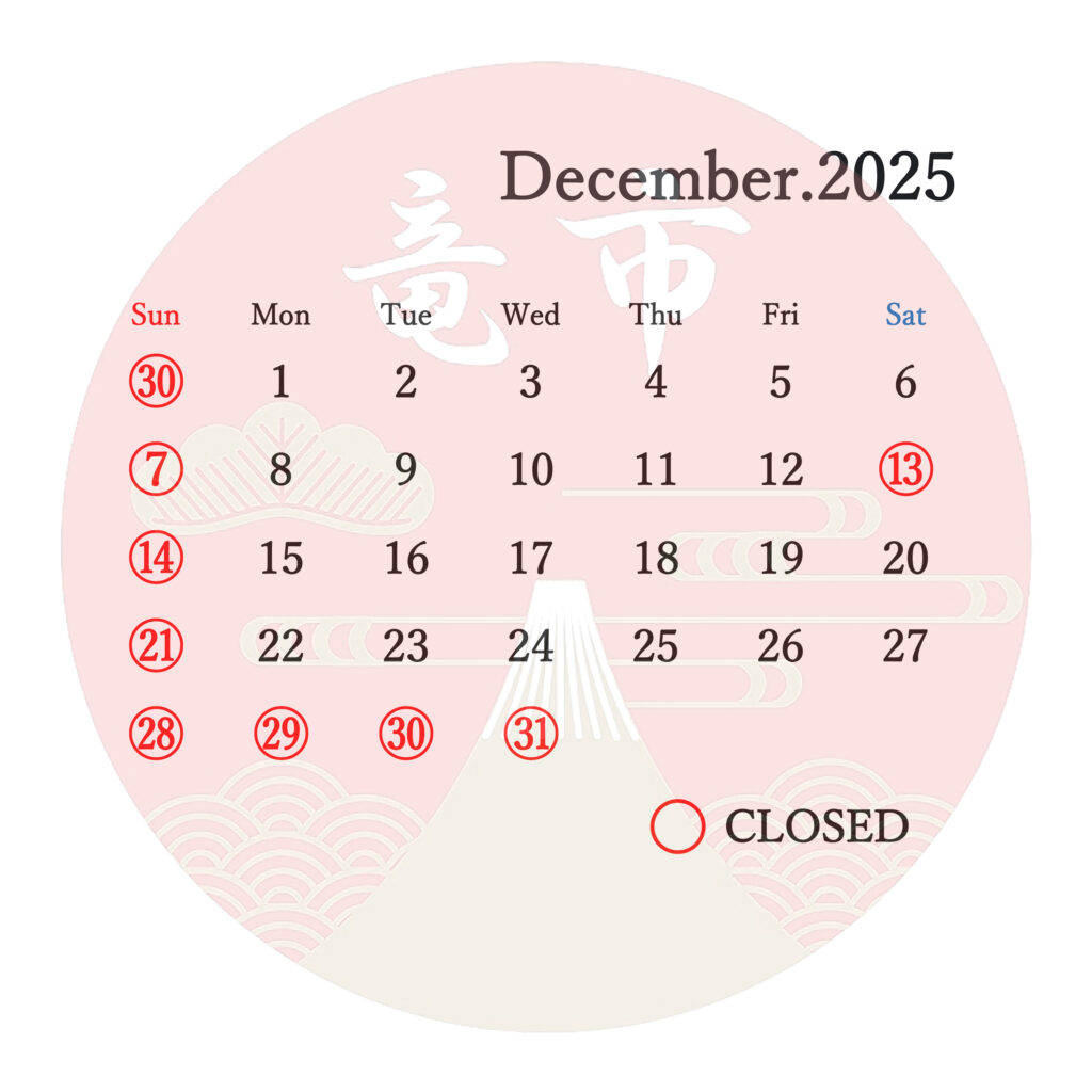 2025年12月は、上記丸印の日付を休業日とさせていただきます。